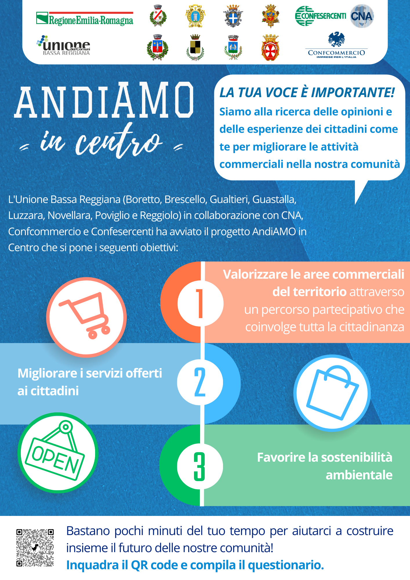 Progetto di valorizzazione della rete commerciale “AndiAMO in Centro”, un progetto promosso dall’Unione Bassa Reggiana in collaborazione con le associazioni di categoria CNA, Confcommercio e Confesercenti.