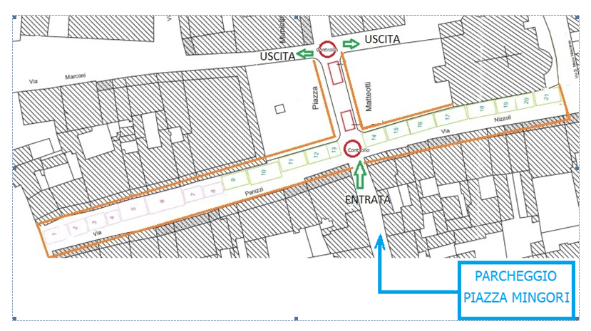 Fatti salvi eventuali ulteriori provvedimenti governativi o regionali ulteriormente restrittivi o limitativi, per le motivazioni di cui sopra, e con le misure e cautele di seguito riportate, di adottare il Piano di Sicurezza, come in planimetria mostrata in figura, privilegiando il parcheggio di Piazza Mingori, inerente perimetrazione, controllo degli accessi, sorveglianza pubblico o privata e applicazione di tutte le misure anticovid approvate con Ordinanza del Presidente della Regione n. 82 del 17/05/2020 e smi;