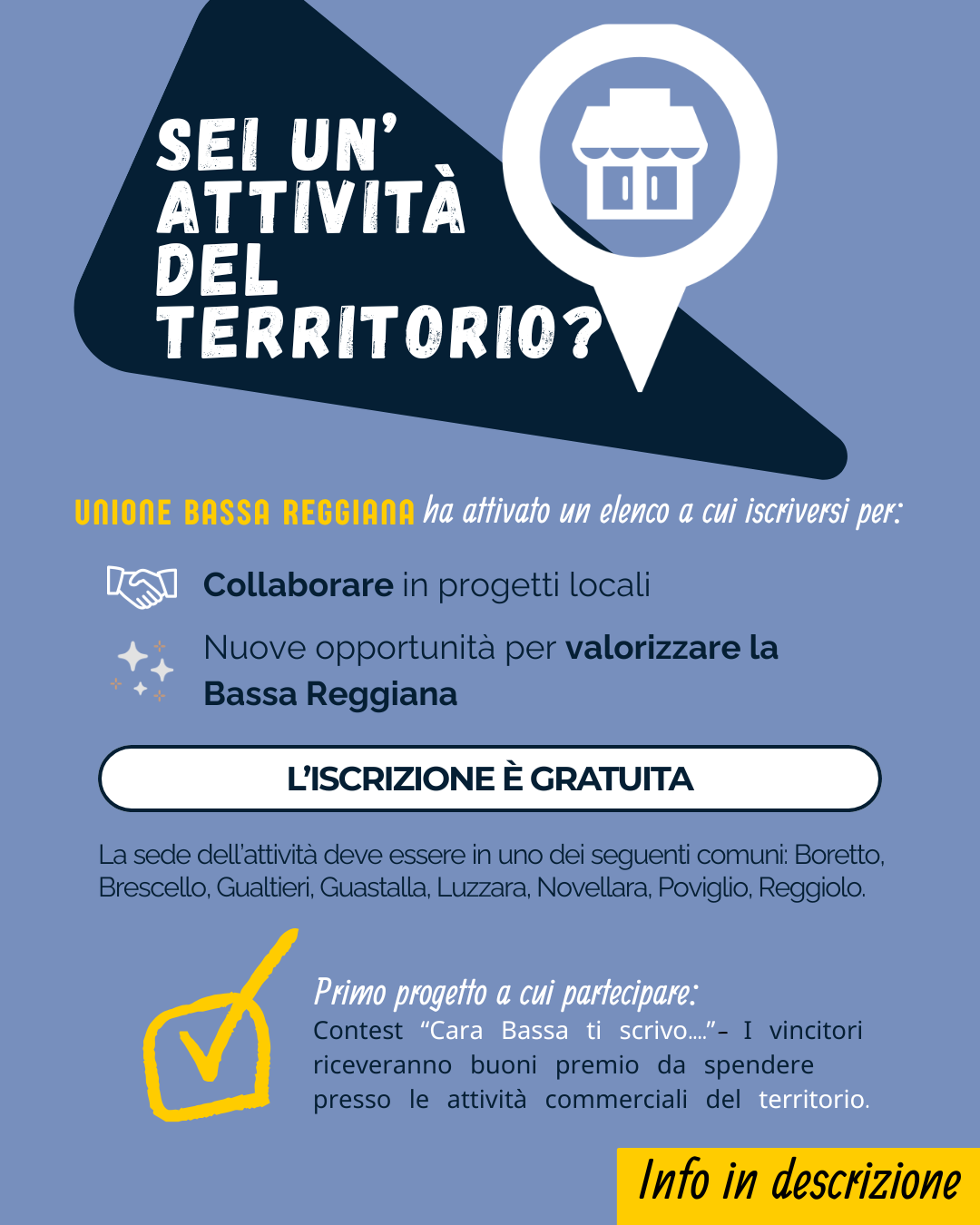 - Tutte le attività con sede in uno degli 8 Comuni dell’Unione: Boretto, Brescello, Gualtieri, Guastalla, Luzzara, Novellara, Poviglio, Reggiolo.