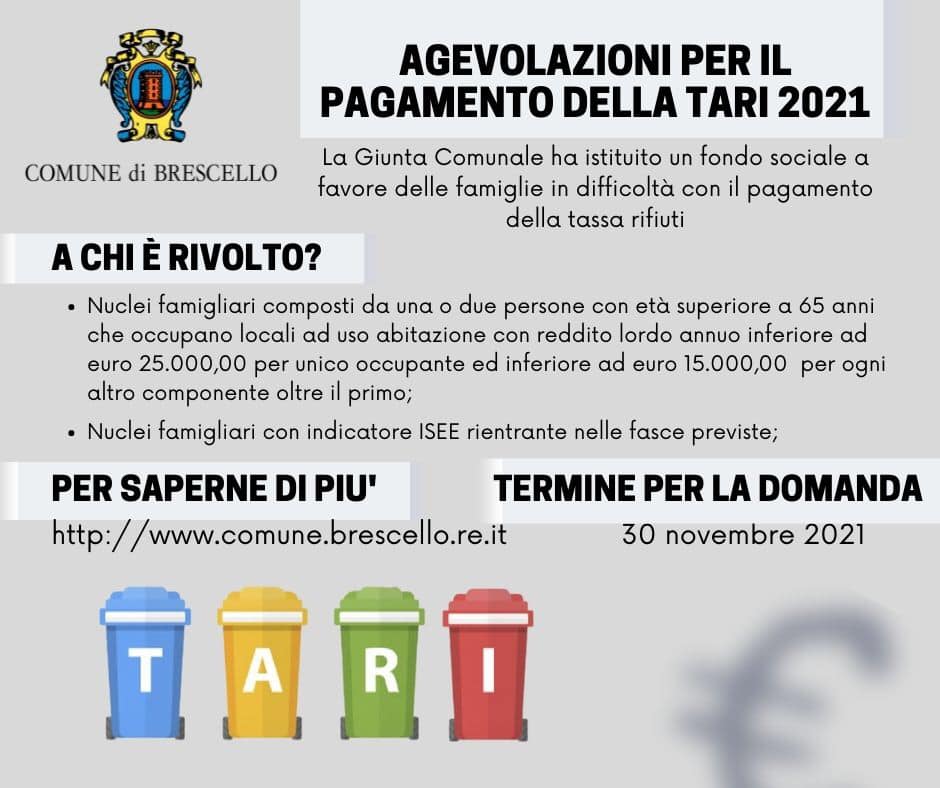 Con Deliberazione della Giunta Comunale n. 84 del 10/09/2021, è stata approvata l’istituzione di un fondo sociale, come previsto dall’art. 8 del Regolamento TARI, finalizzato al sostegno delle situazioni di incapacità delle famiglie a far fronte al pagamento del tributo, i cui requisiti di accesso per l’anno 2021 vengono così disposti: