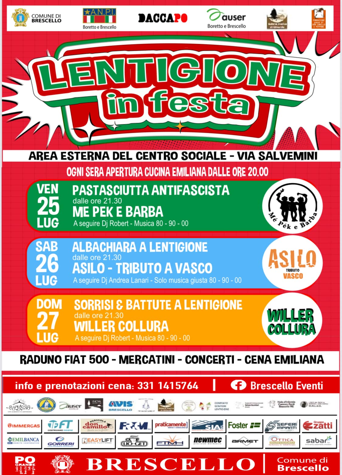25, 26 e 27 luglio 2025. Promossa dall'Associazione Daccapo APS, con il patrocinio del Comune di Brescello. Concerti e cena serale presso Centro Sociale di Lentigione